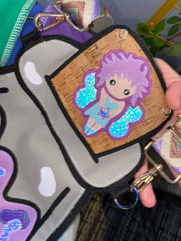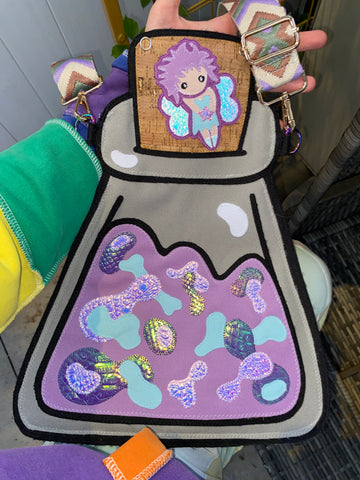 •Features a removable crossbody strap, holographic fabrics, iridescent hardware, & more.
